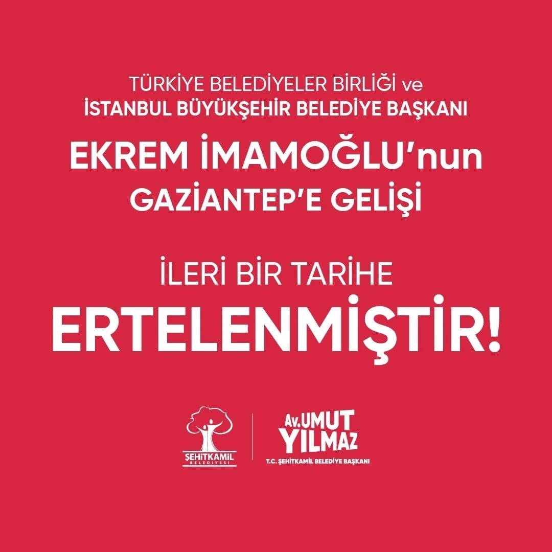 Şehitkamil Belediye Başkanı Umut Yılmaz, sosyal medya üzerinden yaptığı açıklamada, İmamoğlu’nun Gaziantep programının ertelendiğini duyurdu. Yılmaz, "Türkiye Belediyeler Birliği ve İstanbul Büyükşehir Belediye Başkanımız Sayın Ekrem İmamoğlu’nun Gaziantep programı ileri bir tarihe ertelenmiştir. Programı belli olduğunda yeniden bilgilendirme yapılacaktır" şeklinde bir duyuru yaptı. Peki, bu erteleme vatandaşlar arasında nasıl bir etki yaratacak? Gaziantep halkı, programın ne zaman yapılacağını merakla bekliyor.