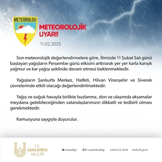 Şanlıurfa Valiliği, olumsuz hava koşulları ve beklenen yağış nedeniyle vatandaşları uyardı. "Yağışların etkisiyle soğuk hava ve buzlanma, don gibi durumların yaşanması muhtemeldir. Bu nedenle, vatandaşlarımızın dikkatli ve tedbirli olmaları gerekmektedir." denildi. Herhangi bir acil durumda 112 Acil Çağrı Merkezi’ne başvurulması önerildi.