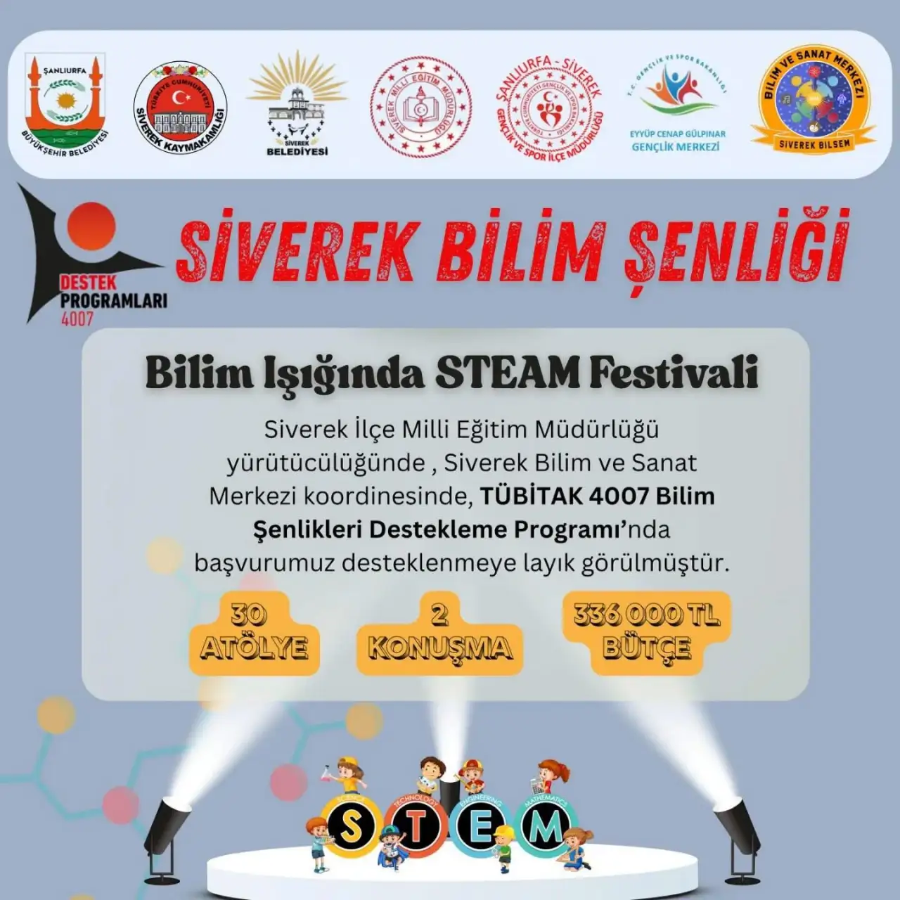 Şanlıurfa’nın Siverek ilçesi, kısa süre içerisinde gerçekleşecek olan dev bir bilim festivaline ev sahipliği yapmaya hazırlanıyor. “Bilim Işığında STEAM Festivali” adıyla düzenlenecek etkinlik, Siverek İlçe Milli Eğitim Müdürlüğü'nün organizasyonuyla ve Siverek Bilim ve Sanat Merkezi’nin koordinasyonunda TÜBİTAK 4007 Bilim Şenlikleri Destekleme Programı kapsamında desteklenmeye değer görüldü. Bu önemli gelişme, ilçede bilime duyulan ilgiyi artırma ve genç nesillere keşfetme arzusu aşılamayı hedefliyor.