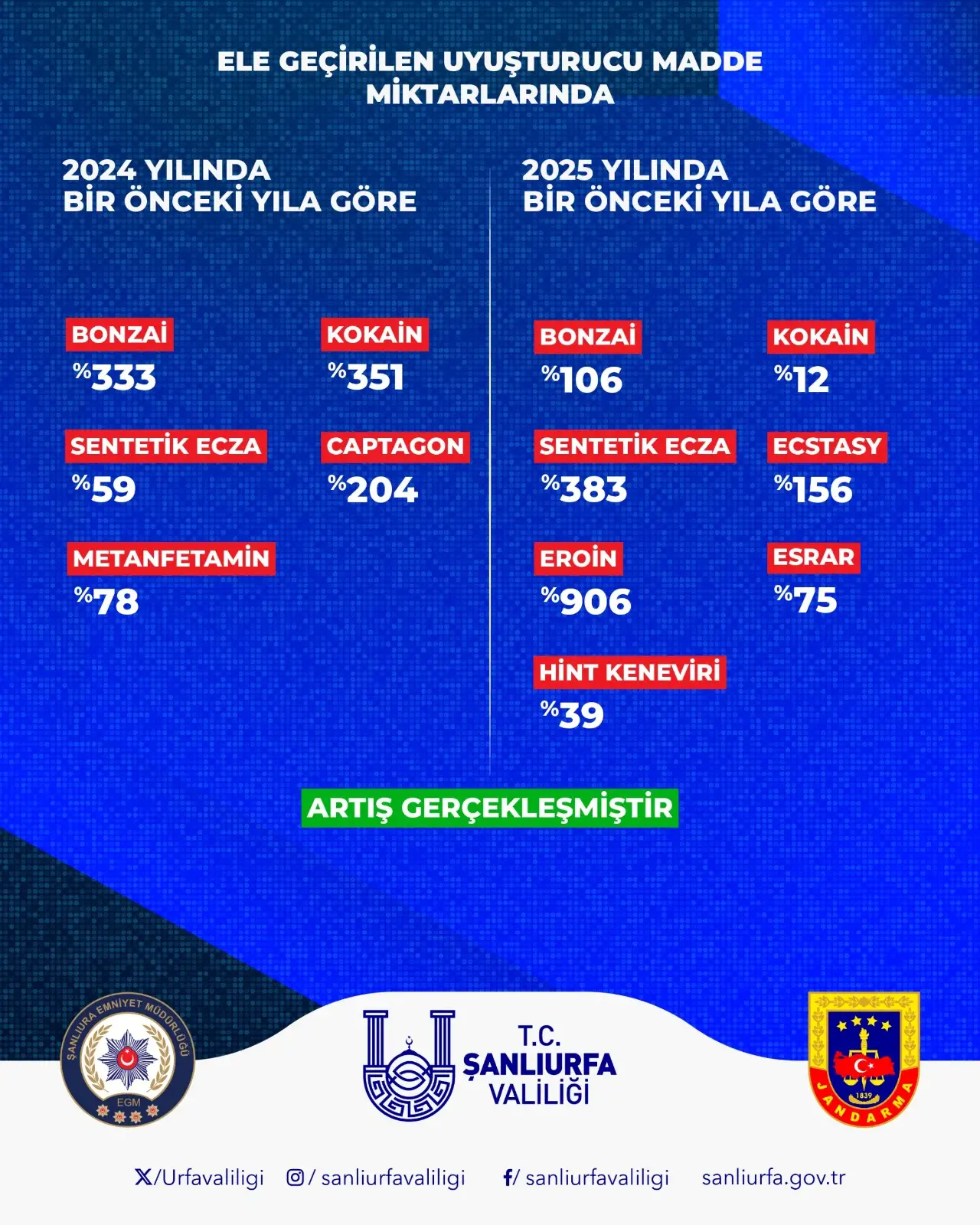 Uyuşturucuyla mücadele, Şanlıurfa’nın en önemli gündem maddelerinden biri olarak raporda geniş yer buldu. Özellikle 2025 yılında eroinde elde edilen yüzde 906’lık ve sentetik eczadaki yüzde 383’lük rekor yakalama oranları, zehir tacirlerine vurulan darbenin büyüklüğünü ortaya koydu. 2024 yılında ise bonzai yakalamalarında yüzde 333, kokainde ise yüzde 351 gibi sarsıcı artışlar kaydedildi. Bu operasyonların yargı ayağında da ciddi bir başarı sağlandığı; 2025 yılında uyuşturucu imal ve ticareti suçundan 1002 kişinin tutuklanarak demir parmaklıklar ardına gönderilmesiyle tescillendi.