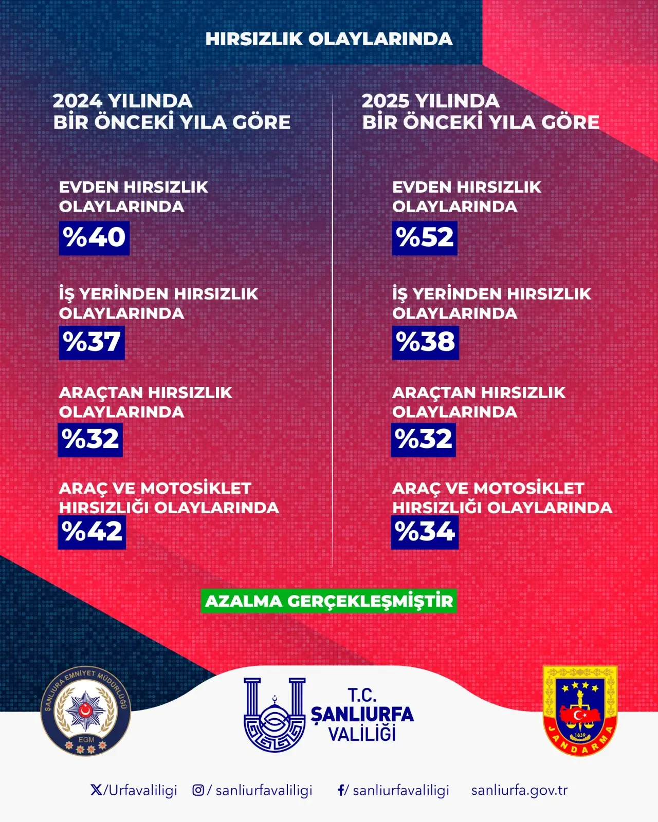 Vatandaşın mal güvenliğini doğrudan ilgilendiren hırsızlık vakalarında ise Şanlıurfa adeta bir dönüşüm yaşadı. 2024 yılında evden hırsızlık olayları yüzde 40 azalırken, bu başarı 2025 yılında yüzde 52’lik bir düşüşle zirveye ulaştı. İş yeri, araç ve motosiklet hırsızlıklarında da her iki yıl boyunca yüzde 30 ile yüzde 42 arasında değişen büyük azalmalar kaydedildi. Vali Hasan Şıldak, bu kapsamlı başarının mimarı olan yöneticileri ve sahada alın teri döken personeli tebrik ederek, Şanlıurfa’nın huzuru için bu disiplinin gelecekte de tavizsiz bir şekilde sürdürüleceği mesajını verdi. Haber Feyzi DONAN