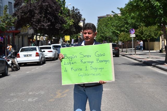 Siverek Belediyesi Zabıta Müdürlüğünde görevli Hilmi Özkürkçü (50), öğrencilerin sınav sırasında sürücüler tarafından korna çalınarak rahatsız edilmemesi için 2 pankart hazırladı.