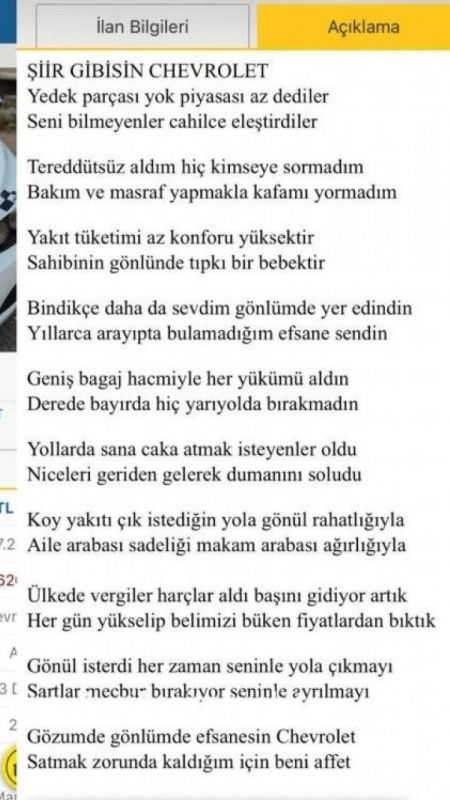Mehmet Batman adıyla oluşturduğu online araç satış sitesine aracını satışa sunan vatandaş aracının açıklamalar kısmında sıra dışı bir şekilde aracına methiyeler sundu. Bu methiyeler hem aracına duyduğu sevgiyi hem de aracın özelliklerini anlatmaya yeterli sayılabilecek düzeydeydi. Aracın satılığa konulduğu sözler şu şekilde: