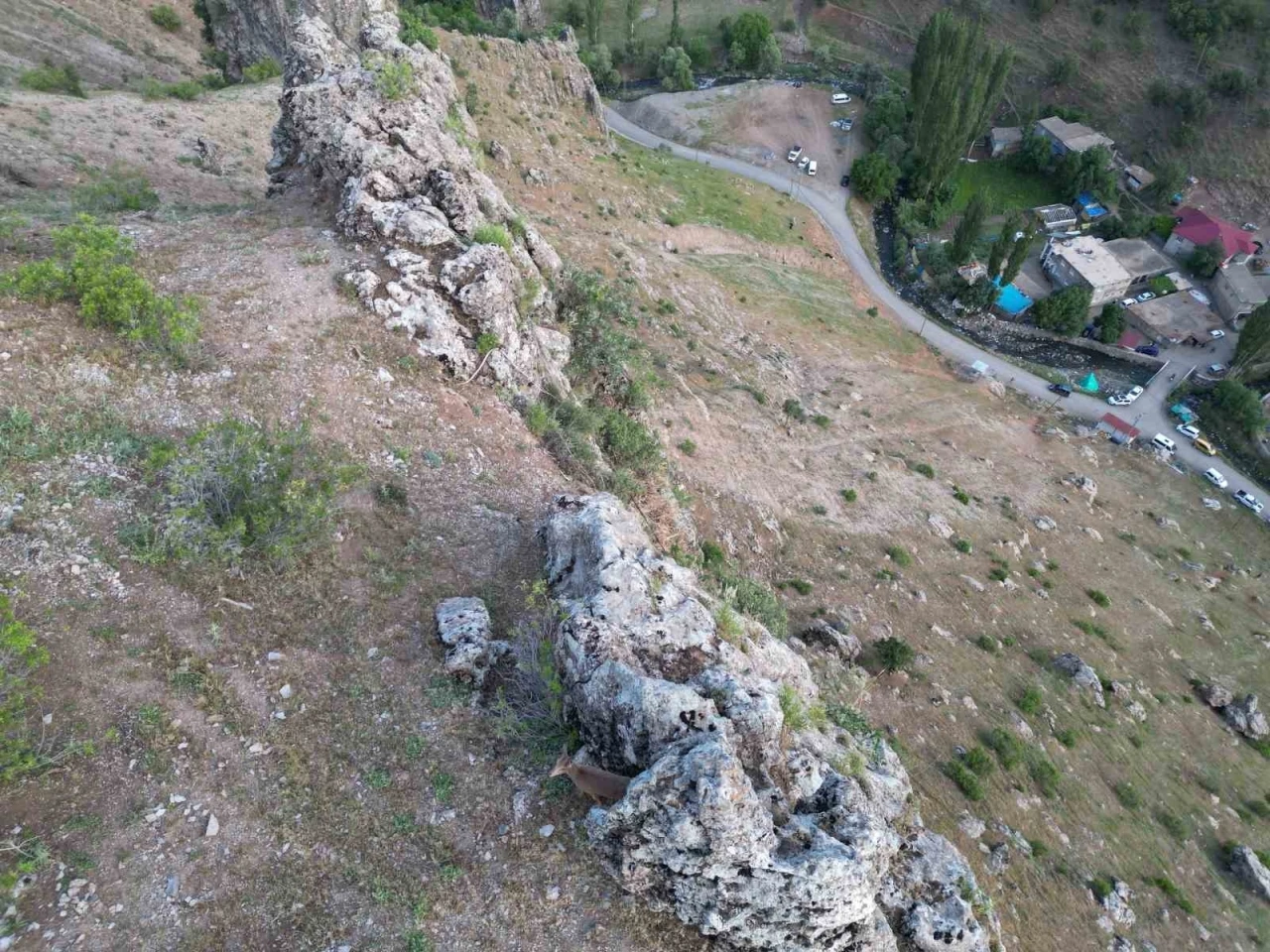 Çoban, karşılaştığı ilginç durumu kaçırmamak için yanında bulundurduğu drone'u havalandırarak bu anları kayıt altına aldı. Görüntülerde, dağ keçilerinin önce bir mağaraya sığındığı, ardından temkinli adımlarla köy keçilerinin içine karışmaya çalıştığı net biçimde görülüyor. Bu anlar, doğanın köye inen yüzünü gözler önüne serdi.