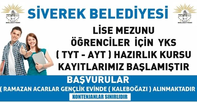 Belediye Kültür müdürlüğümce verilen ücretsiz kurs bilgisi belediye sosyal medya hesaplarında şu şekilde duyuruldu ”Belediyemiz tarafından tamamen ücretsiz verilen; Lise Mezunu Öğrenciler için YKS (TYT-AYT) Hazırlık Kurs Kayıtlarımız başlamıştır. Başvuru için: Ramazan Acarlar Gençlik Evi (Kaleboğazı) yanında yapılmaktadır” denildi.