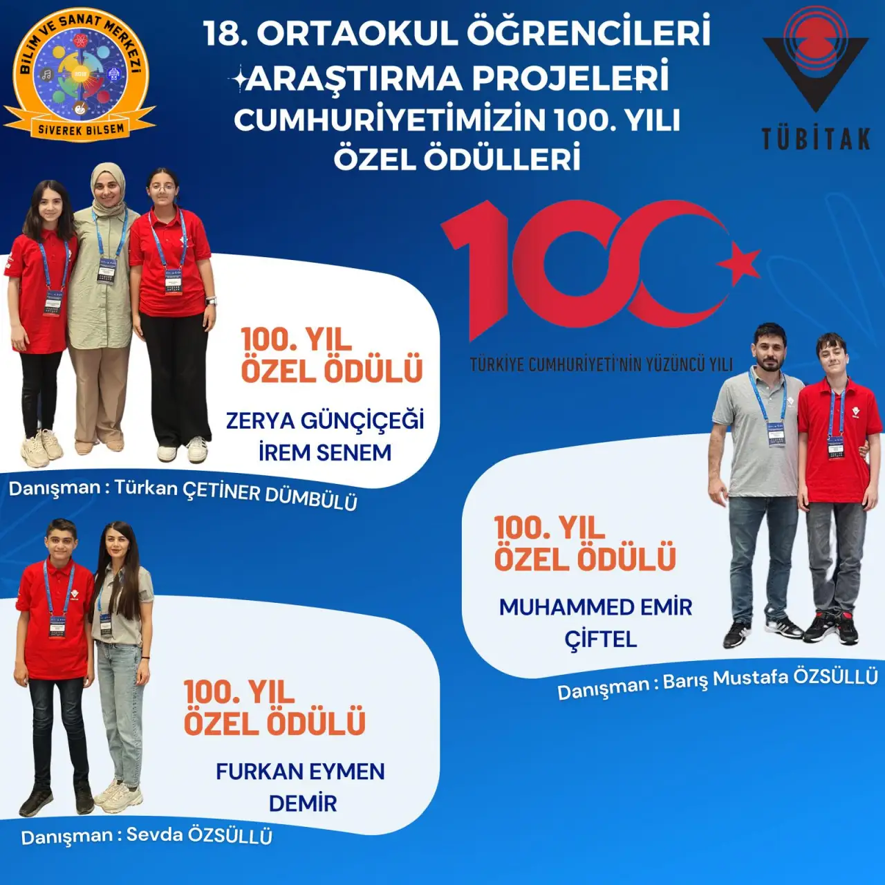 Bu başarıda, Siverek BİLSEM öğrencileri ve danışman öğretmenlerinin özverili çalışmaları büyük rol oynadı. Zerya Günçiçeği ve İrem Senem Danışman öğretmenleri Türkan Çetiner Dümbülü rehberliğinde 100. Yıl Özel Ödülü’nü kazandı. Ayrıca, Muhammed Emir Çiftel’in Danışman Barış Mustafa Özsüllü, Furkan Eymen Demir’in ise Danışman Sevda Özsüllü eşliğinde sundukları projeler de ödüle layık görüldü. Bu projeler, eğitim dünyasında fark yaratacak nitelikte olup, öğrencilerin ve danışmanlarının titiz çalışmalarının bir sonucudur.