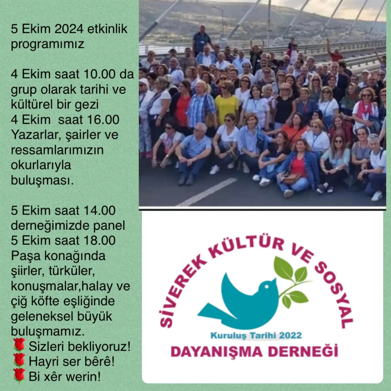 Şanlıurfa’nın Siverek ilçesinde, yurt içi ve yurt dışında yaşayan Siverek Lisesi mezunları bu yıl da bir araya geliyor. Her yıl olduğu gibi, Siverek Kültür ve Sosyal Dayanışma Derneği’nin çatısı altında buluşan mezunlar, ilçenin kültürüne katkıda bulunacak çeşitli etkinlikler düzenlemeye hazırlanıyor. 4-5 Ekim tarihlerinde yapılacak bu etkinlikler, hem Siverek halkını hem de farklı şehir ve ülkelerde yaşayan mezunları bir araya getirecek.