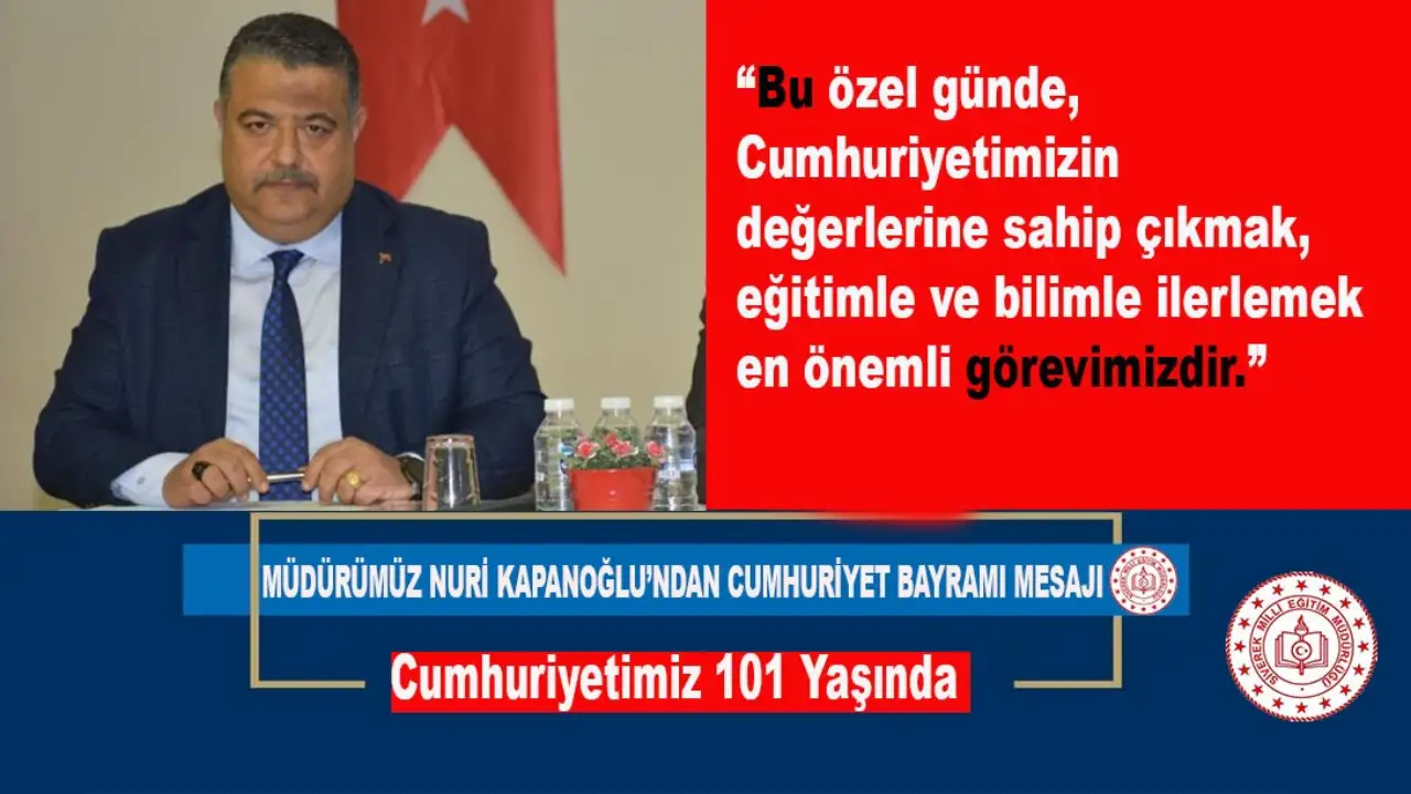 Şanlıurfa Siverek Milli Eğitim Müdürü Nuri Kapanoğlu, 29 Ekim Cumhuriyet Bayramı dolayısıyla yayımladığı mesajında, Türkiye Cumhuriyeti'nin kuruluşunun önemine değindi. Kapanoğlu, mesajında Cumhuriyet'in, Gazi Mustafa Kemal Atatürk'ün önderliğinde kazanılan bağımsızlık mücadelesinin en büyük başarısı olduğunu vurguladı. Cumhuriyet'in, halkın iradesinin, bilimin ve aklın egemenliğinin bir simgesi olarak Türk milletine armağan edildiğini ifade etti.