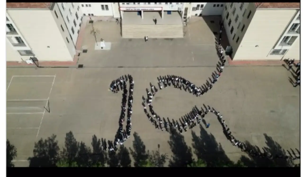 Okul bahçesinde gerçekleştirilen koreografide öğrenciler, kırmızı-beyaz renklerle oluşturdukları görsellerle Türkiye Cumhuriyeti’nin simgelerini canlandırdı. Müzik eşliğinde yapılan gösteri, izleyenlerden tam not aldı.