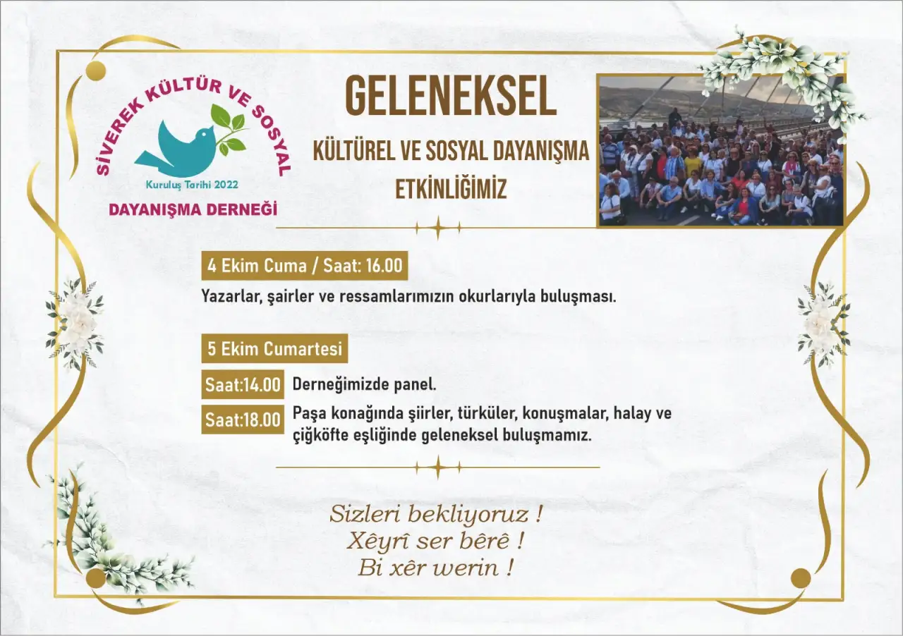 Siverek Kültür ve Sosyal Dayanışma Derneği, bu etkinlik ile Siverek’in kültürel mirasını ve sosyal dayanışmayı bir kez daha gündeme taşıyor. Hem yerel halk hem de dışarıdan gelen misafirler için bu organizasyon, şehrin tarihi ve kültürel değerlerinin ne kadar önemli olduğunu hatırlatıyor. Herkesin bu etkinlikten yeni bilgiler ve güzel anılarla ayrılması bekleniyor.