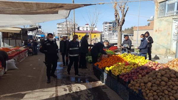 Semt pazarına alışverişe gelen vatandaşlara maske dağıtımı yapan ekipler, pazarcılara maske ve sosyal mesafe konusunda dikkatli olmalarını anımsattı.