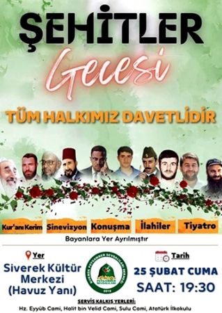 Siverek Peygamber Sevdalıları Derneği tarafından “Şubat Ayı Şehadet Ayı” münasebetiyle “Şehidler Gecesi” isimli program düzenlenecek.