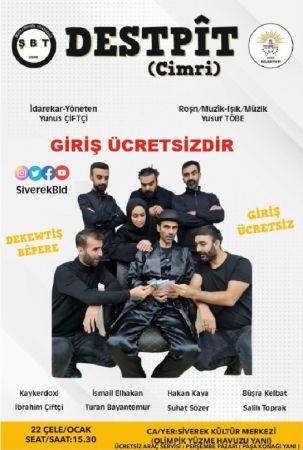 Şanlıurfa kara yolundaki Siverek Kültür Merkezi’nde 22 Ocak Pazar günü saat 15.30’da Bingöl Şehir Tiyatrosu ekibi tarafından Destpit (Cimri) adlı oyun sahnelenecek.