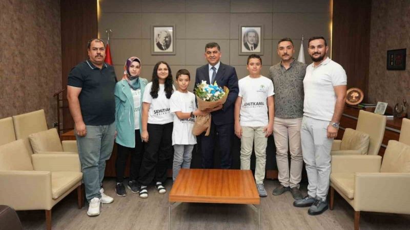TEKNOFEST çerçevesinde bu yıl ilk olarak Ankara’da düzenlenen Deneyap Kart Robotik (ROBOLİG) yarışmasına katılan Bilim Şehitkamil ’Şehitkamil Kızılelma’ takımı, geliştirdikleri “Akıllı Karavan” projesiyle bin 500 proje arasında, Türkiye 5.’si olmayı başardılar. Şehitkamil Kızıl Elma Takımından Ahmet Barut, Hayrunnisa Polat, Yusuf Türüdü ve takım danışmanı Asım Barut elde ettikleri başarıyı paylaşmak ve sağlanan imkanlar dolayısıyla teşekkür etmek için Şehitkamil Belediye Başkanı Rıdvan Fadıloğlu’nu makamında ziyaret etti. Sohbet ortamında geçen ziyarette, Şehitkamil Kızılelma Takım kaptanı Ahmet Barut, yapılan yarışmayla ilgili ve gerçekleştirdikleri projeyle ilgili Başkan Fadıloğlu’na bilgi verdi. Başkan Rıdvan Fadıloğlu, öğrencileri başarılarından ötürü tebrik ederek, kendilerine çeşitli hediyeler takdim etti.