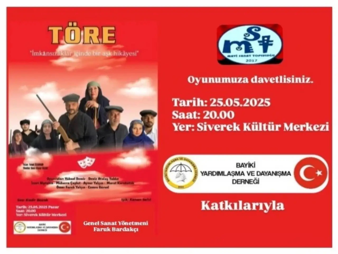 Şanlıurfa’nın Siverek ilçesi, bu kez önemli bir sanat etkinliğiyle gündeme geliyor. Bayiki Yardımlaşma ve Dayanışma Derneği’nin organizasyonuyla sahnelenecek olan “Töre” adlı tiyatro oyunu, 25 Mayıs Pazar günü saat 20.00’da Siverek Kültür Merkezi’nde izleyicilerle buluşacak. Gaziantep Mavi Sanat Topluluğu tarafından sahnelenecek bu eser, klasik tiyatro izleyicisine olduğu kadar sosyal mesaj arayanlara da hitap edecek.