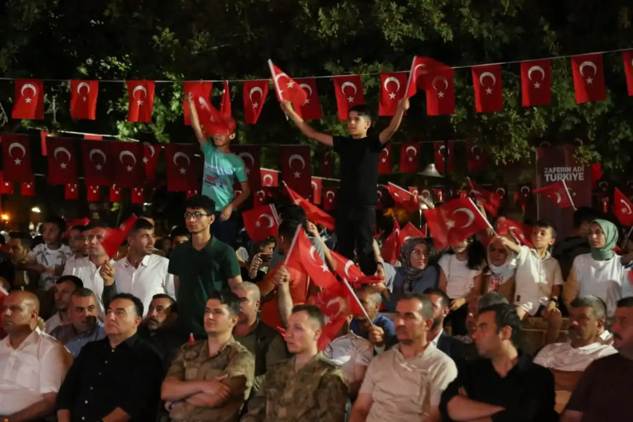 diyen protokol üyeleri, gençlerin milli duygularla sahneye çıkmasından duydukları memnuniyeti dile getirdi. Gecenin finali ise saat 00.13’te camilerden okunan sela sesleriyle gerçekleşti. Bu an, alanda bulunan herkesi derinden etkileyen manevi bir atmosfer yarattı.