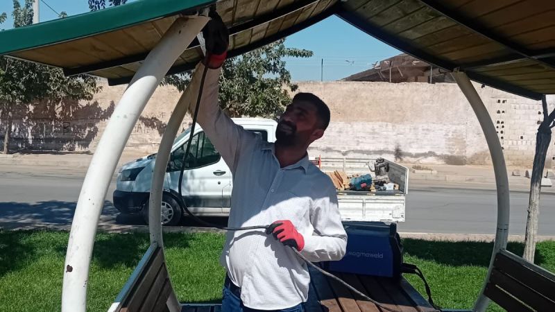Parkların yapısal peyzajında inşaat atığı taş ve betonları yeniden değerlendirerek çevre korumada büyük bir adım atan Eyyübiye Belediyesi, parklarda vatandaşın kullanımına sunulan kamelya, bank, çöp kovası ve benzeri açık hava mobilyalarını kendi atölyelerinde üretiyor. Büyük çoğunluğu ilk kullanım sonrası hurdaya çıkan metal ve ahşap malzemelerin yeniden değerlendirilmesiyle üretilen açık hava mobilyaları, belediye bünyesinde çalışan maharetli ustaların elleriyle şehre kazandırılıyor.