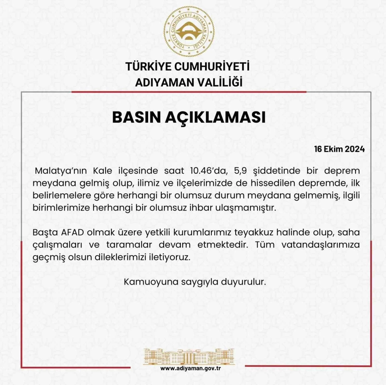 Adıyaman Valiliği’nin yaptığı resmi açıklamada, "İlk belirlemelere göre Adıyaman’da herhangi bir olumsuz durum meydana gelmemiş, ilgili birimlerimize herhangi bir olumsuz ihbar alınmamıştır. Saha taramalarımız devam etmektedir" ifadelerine yer verildi. Valilik, vatandaşlardan da sakin olmalarını ve resmi kaynakları takip etmelerini istedi.