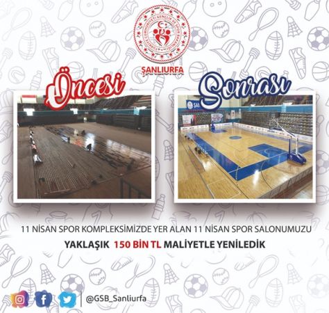 Şanlıurfa Gençlik ve Spor İl Müdürlüğü, 11 Nisan Spor Kompleksinin içerisinde yer alan 11 Nisan Spor salonunun zeminini tamamen yeniledi.