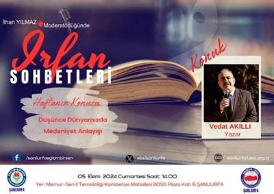 05 Ekim 2024 Cumartesi günü saat 14:00’te, Memur Sen Eğitim Bir Sen sendika binasında gerçekleşecek ilk İrfan Sohbetimizin konusu "Düşünce Dünyamızda Medeniyet Anlayışı" olacak. Bu önemli konuyu ele alarak medeniyetin düşünsel temellerini ve günümüz toplumundaki yansımalarını tartışacağız. Herkesi bu verimli sohbet ortamına davet ediyoruz.
