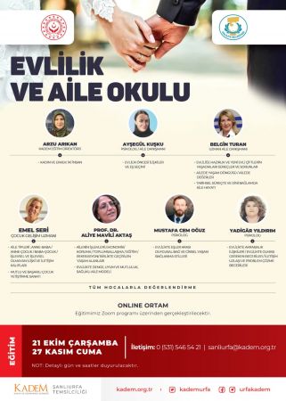 Şanlıurfa KADEM İl Temsilciliği, 21 Ekim- 27 Kasım 2020 tarihleri arasında online ortamda “Evlilik ve Aile Okulu” semineri düzenliyor.