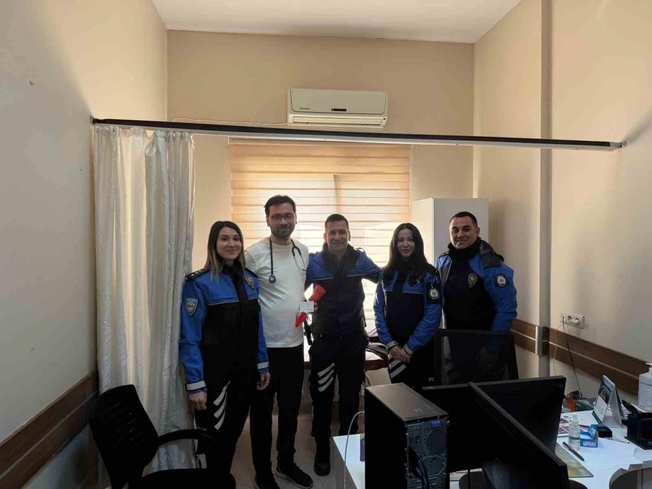 Hastanede görev yapan sağlık çalışanlarını tek tek ziyaret eden polis ekipleri, onların fedakâr çalışmalarını takdir ettiklerini belirterek, tıp bayramlarını kutladı.