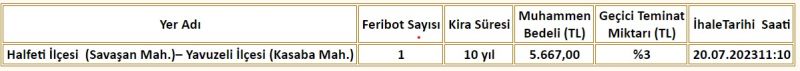 1- Aşağıda Yerlerin adı, muhammen bedeli, geçici teminatı belirtilen Şanlıurfa Büyükşehir belediyesine ait, Feribot yolcu-araç taşıma tekneleri (İç Su Aracı) 2886 Sayılı Devlet İhale Kanununun 45. maddesine göre Açık Teklif Usulü ile kiraya verilecektir.