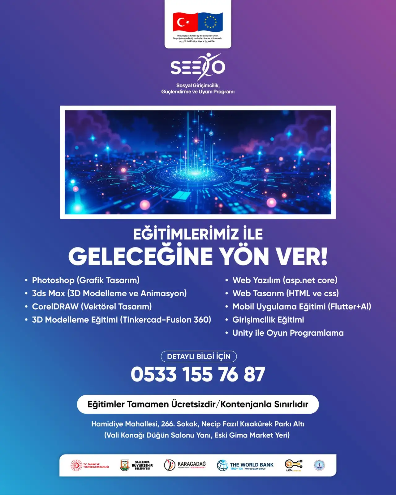 Tüm bu eğitimler tamamen ücretsiz olarak sunuluyor; ancak kontenjanın sınırlı olması, hızlı başvurunun önemini ortaya koyuyor. Gençler, hayal ettikleri kariyere ilk adımı atmak için bu fırsatı değerlendirmek zorunda. Başvuru ve detaylı bilgi için 0533 155 76 87 numaralı telefonla iletişime geçilebiliyor. Şanlıurfa Büyükşehir Belediyesi’nin bu örnek projesi, dijital çağda gençlere yön çizecek sağlam bir temel oluşturuyor. Haber Sedat KIRAN