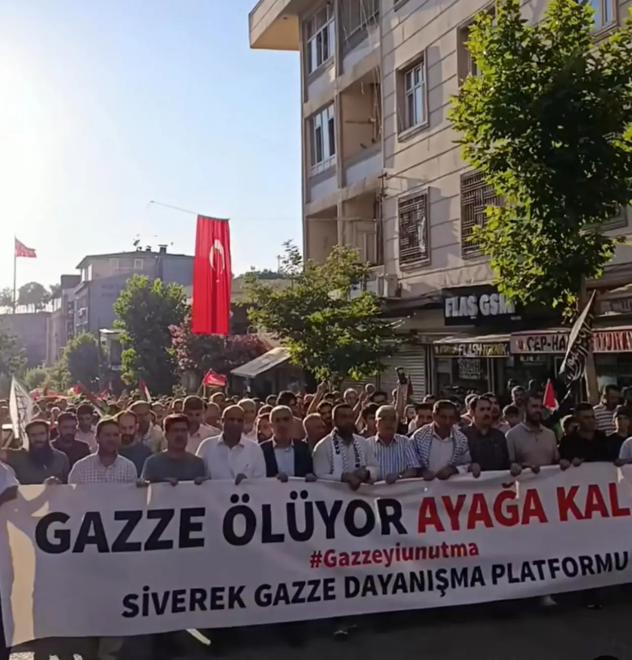 Şanlıurfa’nın Siverek ilçesinde yüzlerce vatandaş, Gazze’de yaşanan insanlık dramına sessiz kalmamak için sokaklara döküldü. İsrail’in Gazze’ye yönelik sürdürdüğü saldırıları protesto etmek ve bölgede yaşanan açlık, susuzluk gibi insani krizlere dikkat çekmek amacıyla Gazze Dayanışma Platformu öncülüğünde bir yürüyüş düzenlendi. Kanlıkuyu Parkı'nda başlayan yürüyüş, Cumhuriyet ve Hürriyet caddeleri boyunca ilerleyerek Aksa Meydanı’nda son buldu. Türk ve Filistin bayraklarıyla yürüyen kalabalık, ellerinde taşıdıkları dövizlerle dünyaya sessiz kalmama çağrısı yaptı.