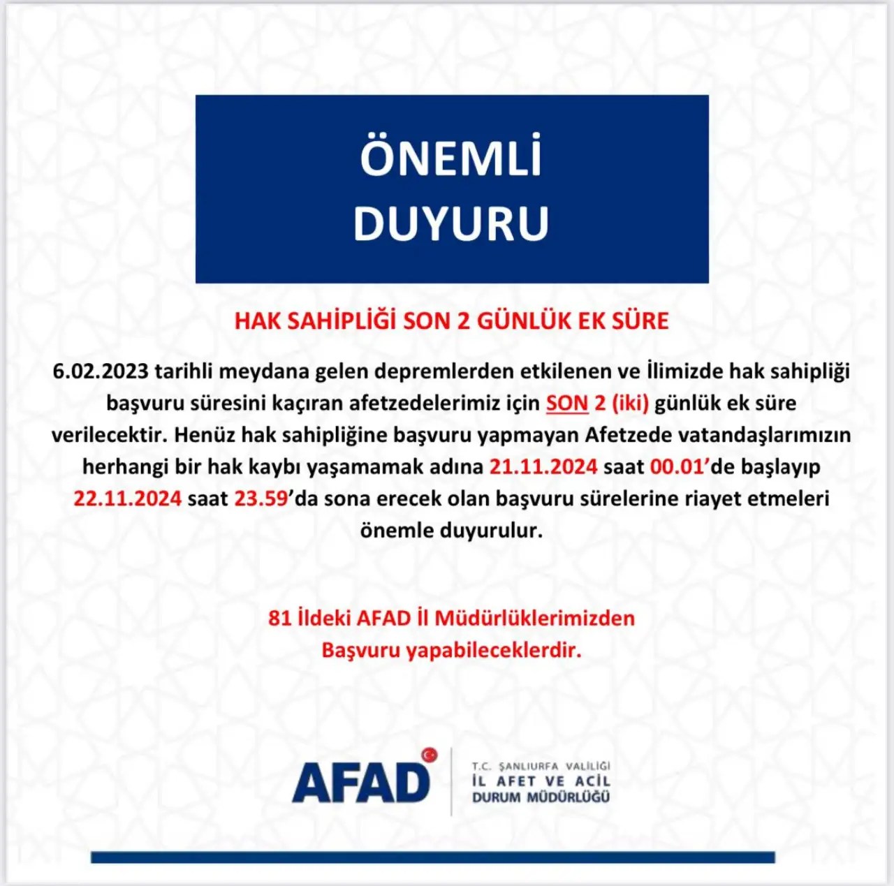 Hak sahipliği başvurusunu henüz tamamlamamış olan tüm afetzedelerimizin, başvuru sürelerine riayet etmelerini önemle rica ediyoruz. Haber Mahmut İZGÖR