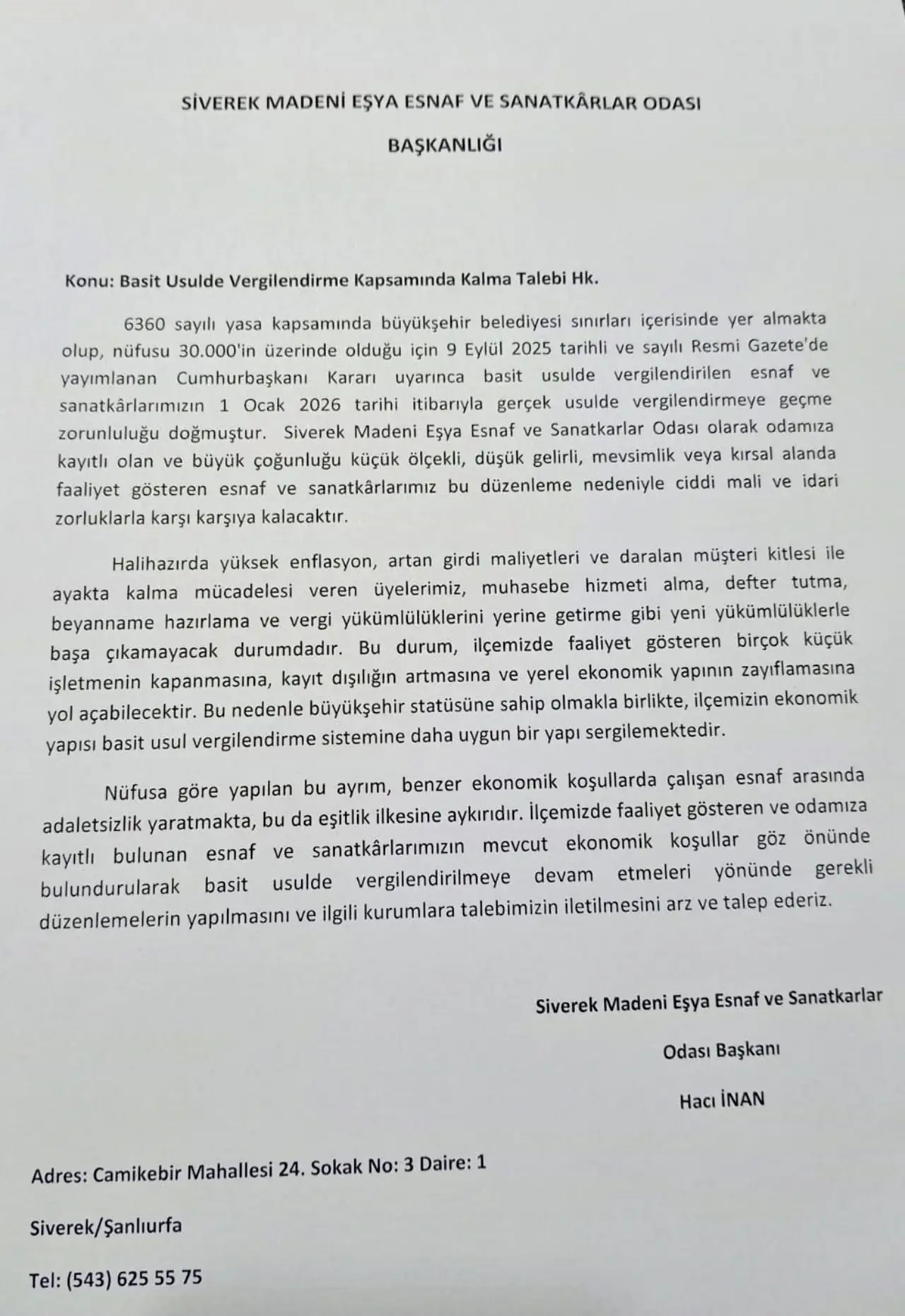 Yazıda dikkat çeken bir diğer nokta ise ilçenin sosyoekonomik yapısına vurgu yapılması oldu. Siverek’in, her ne kadar büyükşehir sınırları içinde yer alsa da, ekonomik açıdan kırsal bir profil çizdiğini belirten İnan, şu ifadelere yer verdi: “İlçemizdeki esnaf ve sanatkârlarımızın büyük çoğunluğu mevsimlik, düşük gelirli ve küçük ölçekli işletmelerden oluşmaktadır. Bu nedenle büyükşehir statüsüne sahip olmamıza rağmen, basit usul vergilendirme sisteminin devam etmesi ilçemizin ekonomik dengesine uygun olacaktır.”