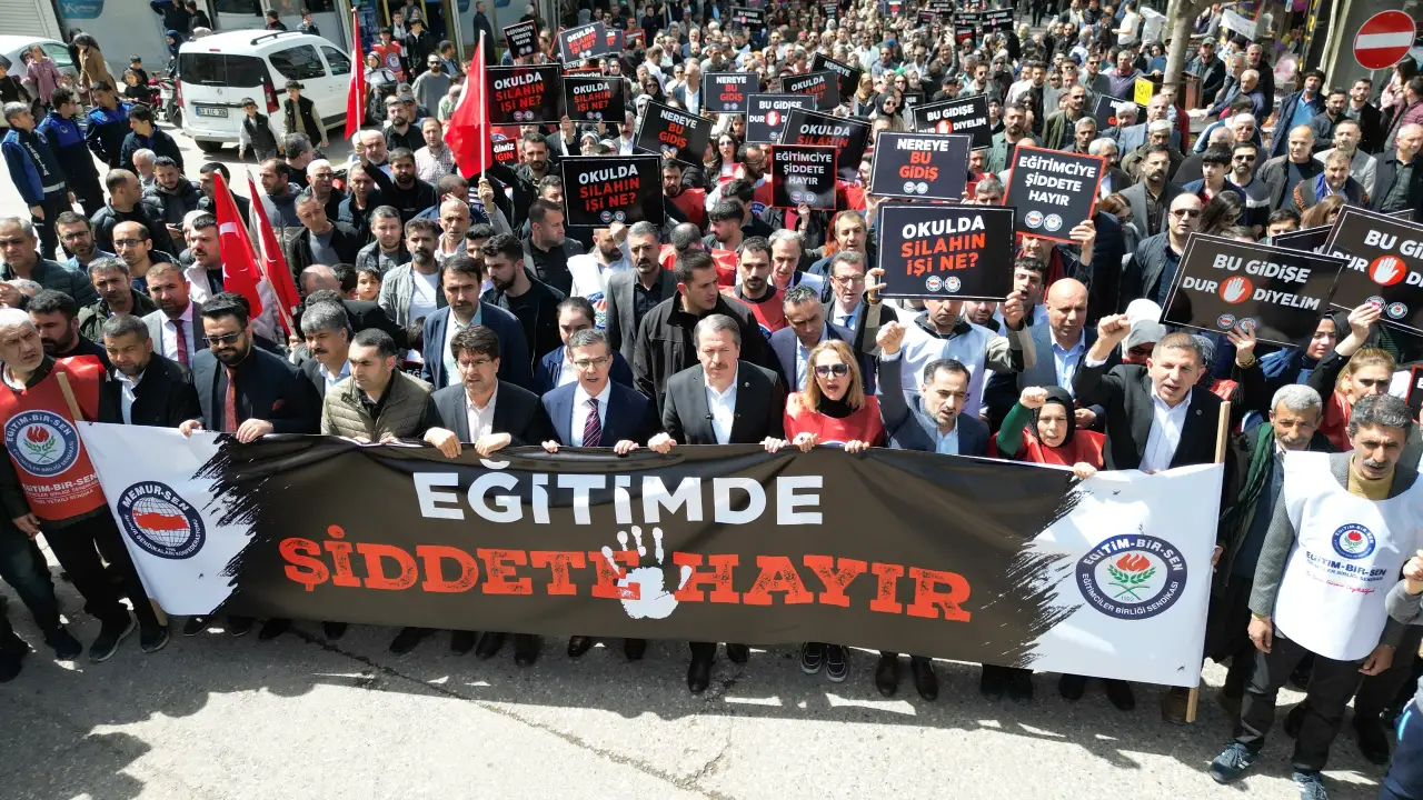 Şanlıurfa’nın Siverek ilçesinde, Ahmet Koyuncu Mesleki ve Teknik Anadolu Lisesi’ne yönelik düzenlenen vahşi saldırının yankıları sokaklara taştı. İlçedeki manevi merkezlerden biri olan Kanlıkuyu Meydanı’nda sabah saatlerinde bir araya gelen binlerce eğitimci, sendika üyesi ve vatandaş, ellerindeki dövizlerle sessiz ama güçlü bir protesto başlattı. Memur-Sen ve Eğitim-Bir-Sen Genel Başkanı Ali Yalçın’ın liderliğinde yürüyüşe geçen kalabalık, Hürriyet Caddesi üzerinden sloganlar eşliğinde ilerleyerek saldırının meydana geldiği lise binasına kadar yürüdü. Yürüyüş boyunca çevredeki esnaf ve vatandaşların da alkışlarla destek verdiği gözlendi; bu durum Siverek halkının eğitimcilere olan vefasını ve şiddete karşı duruşunu bir kez daha tescilledi.