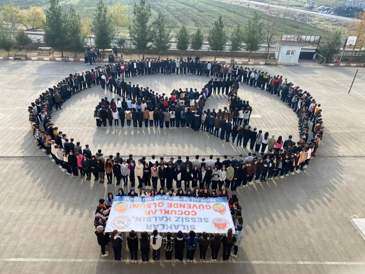 Şanlıurfa’nın Siverek ilçesinde, Şehit Ali Öztürk Anadolu Lisesi öğretmen ve öğrencilerinin katkılarıyla yılbaşı öncesinde anlamlı bir farkındalık etkinliği gerçekleştirildi. Okulun bahçesinde oluşturulan “Silaha Hayır” yazılı koreografi, hem öğrencilerden hem de çevre halkından büyük destek gördü. Etkinlik, toplumda özellikle yılbaşı gecelerinde sıkça karşılaşılan havaya silah sıkma alışkanlığına dikkat çekmeyi amaçladı.