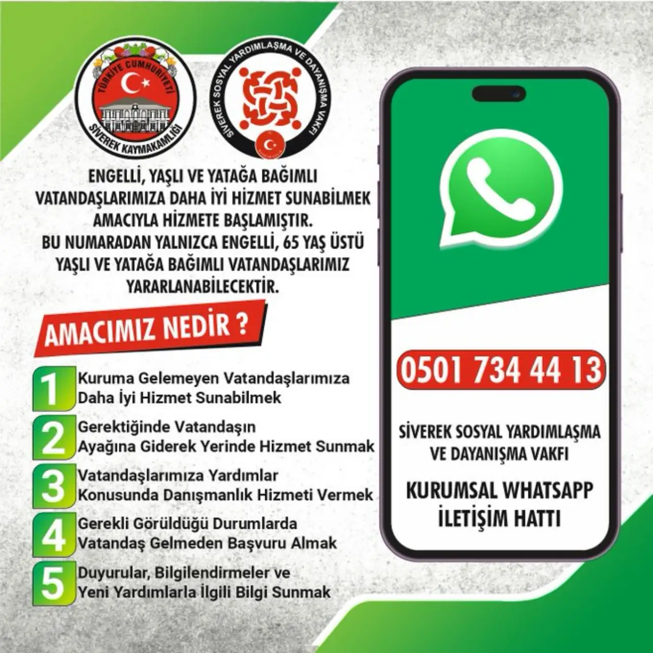 Şanlıurfa'nın Siverek Sosyal Yardımlaşma ve Dayanışma Vakfı, engelli, yaşlı ve yatağa bağımlı bireyler için sunduğu hizmetlere yenisini ekledi. Vakıf, bu bireylerin ihtiyaçlarına daha hızlı ve etkili bir şekilde ulaşmak için WhatsApp destek hattı kurdu. Bu yeni hizmet hattı yalnızca 65 yaş üstü yaşlı, engelli ve yatağa bağımlı vatandaşlarımıza yönelik olup, onların her türlü ihtiyacını yerinde karşılamayı hedefliyor.