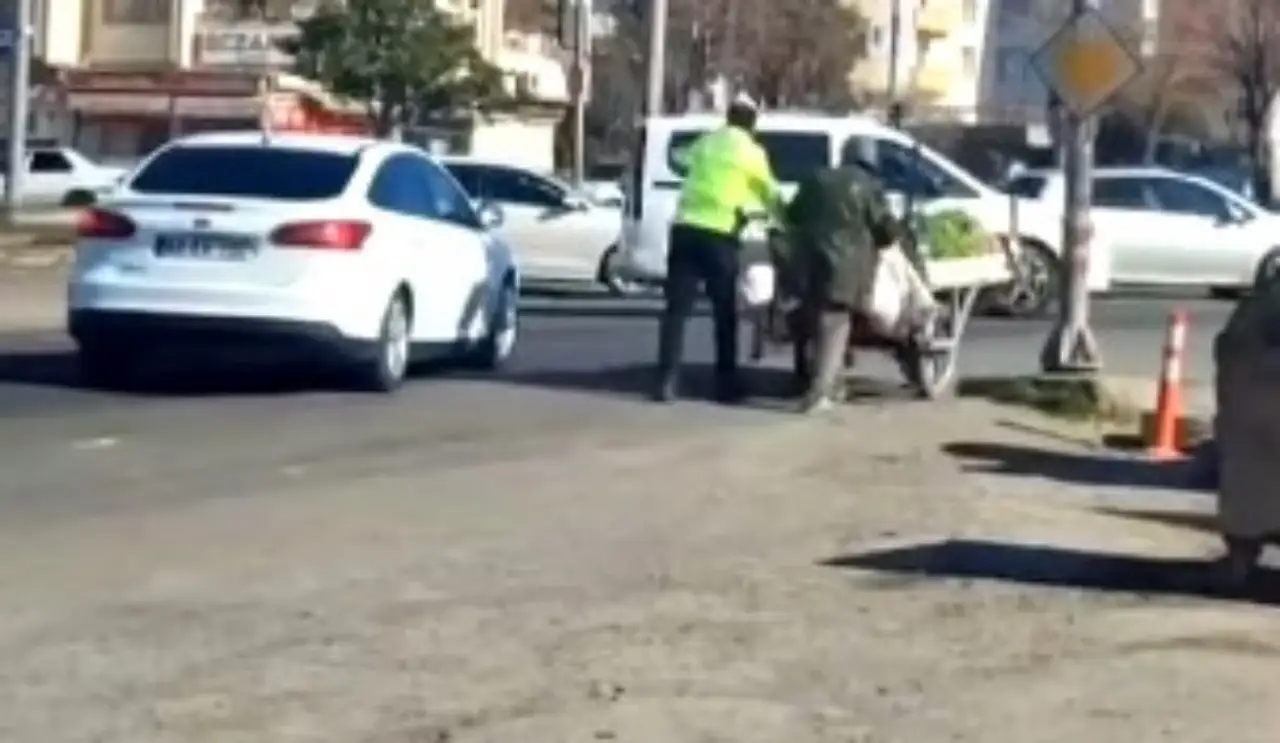 Şanlıurfa’nın Siverek ilçesinde rutin trafik uygulamalarını sürdüren bir polis memuru, görev sırasında beklenmedik bir durumla karşılaştı. Uygulama noktasında ağır bir el arabasını sürmekte zorlanan bir vatandaşı fark eden polis memuru, tereddüt etmeden harekete geçti. Trafiğin yoğun olduğu bir noktada yaşanan bu olay, çevredeki vatandaşların da dikkatini çekti.