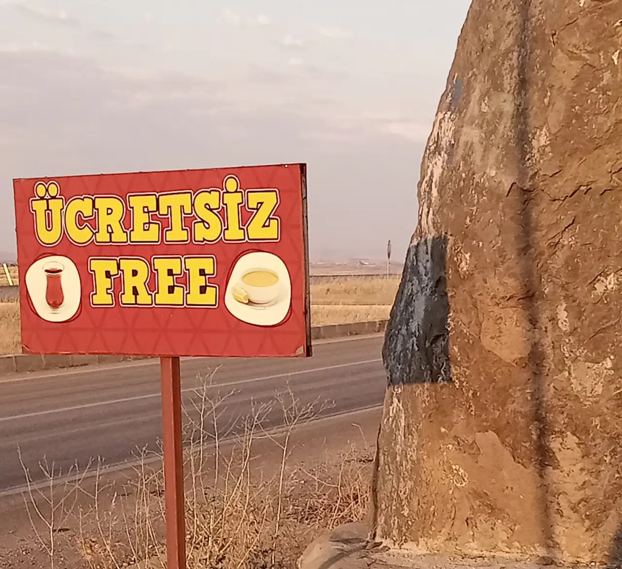 Şanlıurfa'nın Siverek ilçesinden Adıyaman yoluna girdiğinizde yaklaşık 5 kilometre gittikten sonra sol tarafta iki katlı, bazalt taşlı bir bina dikkat çeker. Çıplak ve yalın bir bina olmasına rağmen, kırmızı zemin üzerine sarı renkle yazılı "ÜCRETSİZ FREE" tabelası ve çay ile çorba kasesi fotoğrafları görenlerin ilgisini çeker. Defalarca kullandığım bu yolda, benim de dikkatimi çekmişti bu yazı. Geçenlerde Adıyaman yolu dönüşünde, merak ettiğimiz bu yeri arkadaşlarla ziyaret etmeye karar verdik. Bina asfalt yola çok yakın bir yerdeydi ve arabamızı binanın önüne park edince bizi aydınlık ve güler yüzlü, sakalları ağarmış genç bir adam karşıladı.