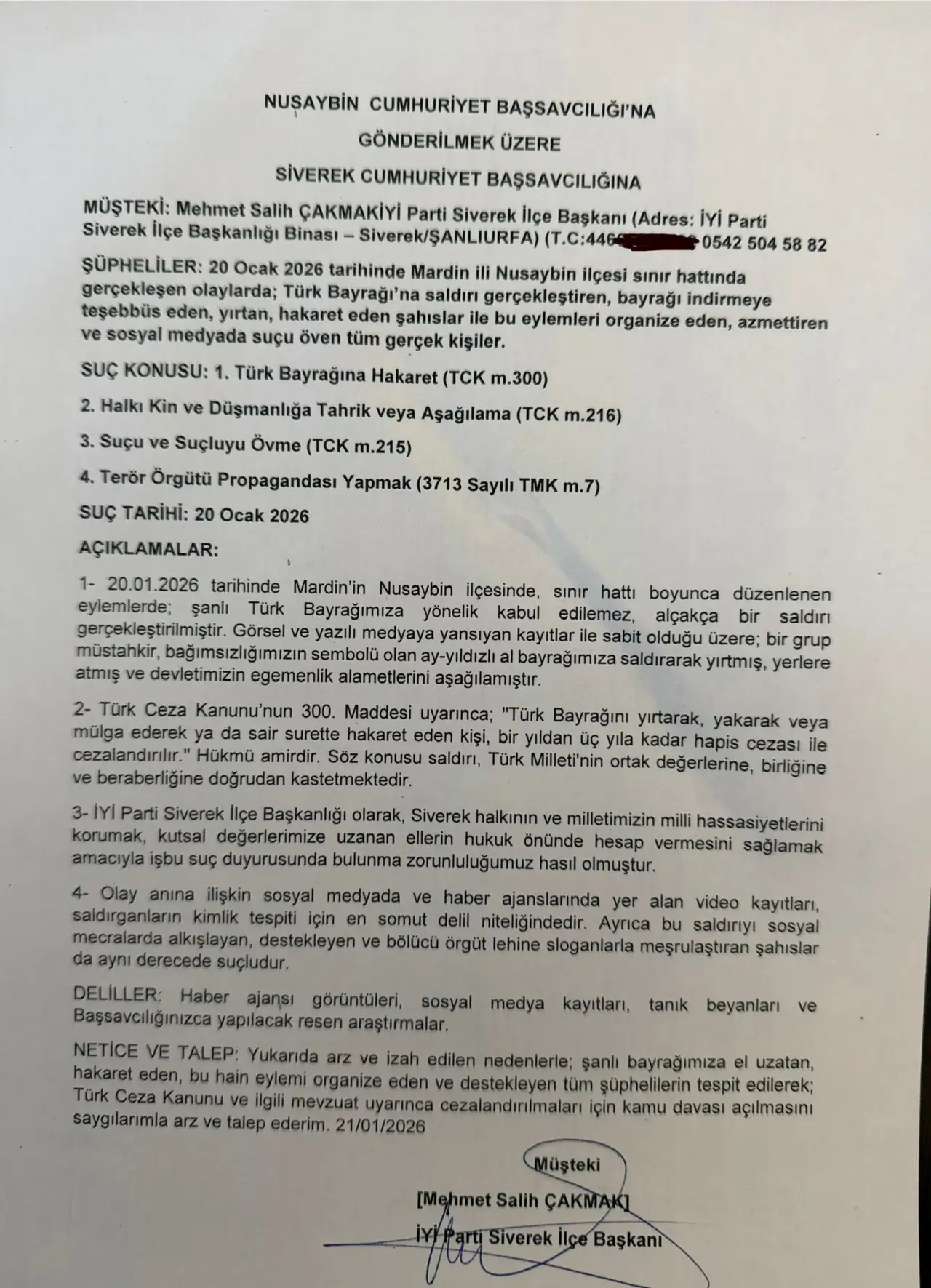 “20 Ocak 2026 tarihinde Mardin’in Nusaybin ilçesinde, sınır hattı boyunca düzenlenen eylemlerde şanlı Türk Bayrağımıza yönelik kabul edilemez, alçakça bir saldırı gerçekleştirilmiştir. İYİ Parti Siverek İlçe Başkanlığı olarak, Siverek halkının ve milletimizin milli hassasiyetlerini korumak, kutsal değerlerimize uzanan ellerin hukuk önünde hesap vermesini sağlamak amacıyla bu suç duyurusunda bulunma zorunluluğumuz hasıl olmuştur. Şanlı bayrağımıza el uzatan ve bu hain eylemi destekleyen tüm şüphelilerin cezalandırılması için davanın takipçisi olacağız.”