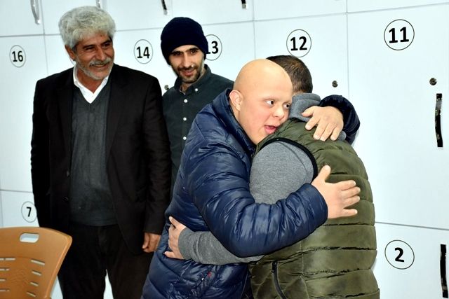 Karşı karşıya gelen down sendromlu arkadaşlar, birbirine sarılarak hasret giderirken, o anda duygulu anlar yaşandı. Dakikalarca birbirine sarılan, birbirlerinin yanaklarından öpen arkadaşlar, daha sonra kestikleri pastayı çatalla birbirlerinin ağzına koydu.