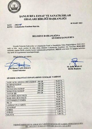 Şanlıurfa Esnaf ve Samatkarlar Odalar birliği Başkanlıgı yemek ve kebap çeşitlerine zam yaptı.