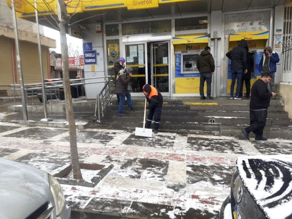 Belediye temizlik işleri müdürlüğü kar yağışıyla birlikte kaldırımlarda biriken karı küreklerle temizlerken, fen işleri ekipleri don ve buzlanmaya karşı tuzlama çalışması yaptılar.