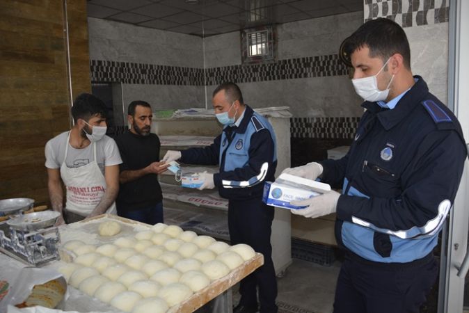 Fırıncıları da unutmayan ekipler, ekmek üretimi yapan esnafı hijyen konusunda uyardıktan sonra maske ve eldiven dağıttı.