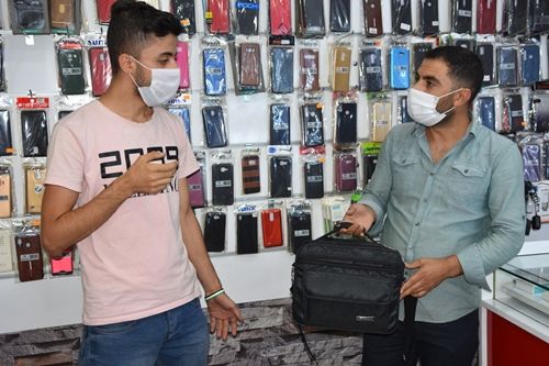 İşyerinde bir araya gelen Suriyeli genç ve telefoncu esnaf bir süre sohbet ederek dükkândan ayrıldı.