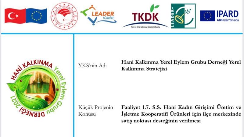 Yapılan ziyarette konuşan başkan Mirza Kayhan gerek proje kapsamında gerekse de diğer tüm işlerinde ilçede faaliyet gösteren kadınlarımıza elimizden gelen her türlü desteği sağlıyoruz. Dernek olarak ilçemizde kadın ve gençlik konusunda faaliyetlerimiz son sürat devam edecek diyen başkan Kayhan; ilçe kaymakamı Abdullah Yüksel Hani Belediye Meclis Üyesi Sıdık Deniz ve beraberindeki heyetle birlikte satış noktasını kooperatif yetkililerine teslim ettikten sonra dernek merkezine gitmek üzere alandan ayrıldılar.